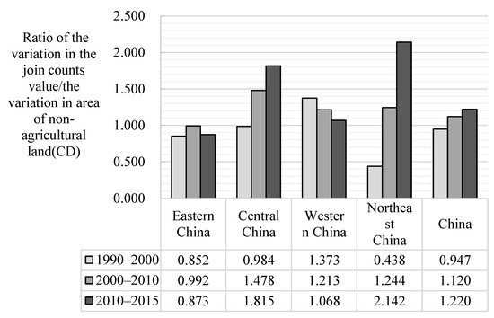 In order to examine the change in the degree of the land-use mixture with each unit increase in the area of non-agricultural land, we used the ratio of the change in the join counts value to the change in the area of the non-agricultural land (denoted as CD) (see Figure 6). From 1990–2010, the highest CD value was not observed in Eastern China but rather in Central China. Moreover, from 2010–2015, the CD values in Eastern and Western China declined significantly, while the CD values in Central and Northeast China increased significantly.