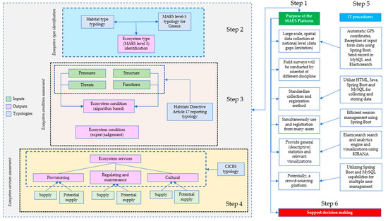 This work provides the first field data collection platform, based on internet technologies, for mapping and assessment of ecosystems and their services in Greece, through direct field observations. It is in line with the assessment guidance and assistance provided by the European Commission and aims to support operational MAES studies, by providing an efficient and low-cost tool for extensive, nation-wide assessment, as the one needed in data-scarce regions, such as Greece. The platform and its outcomes are designed (a) to provide information at the national, regional and EEA reference grid level, (b) to standardize the assessment procedure, (c) to analyze and report MAES-related data from the local to the EU scale, and (d) to guide environmental management strategies and policy making, in the frame of the EU Biodiversity Strategy and the EU Green Deal provisions.