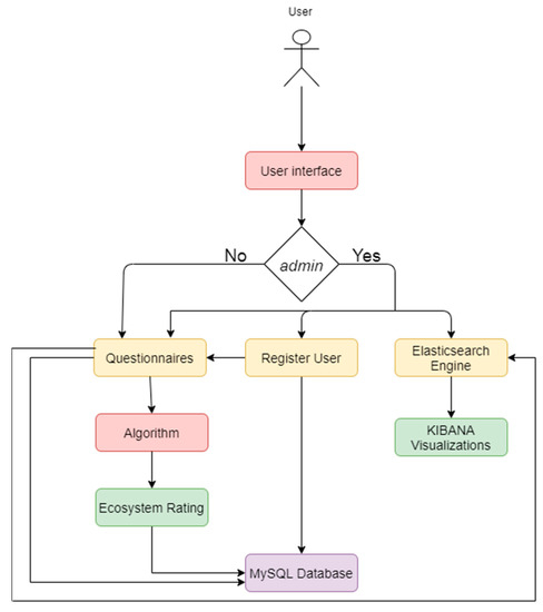 Firstly, for the online MAES_GR platform, users need to log in to their accounts to have access to the platform. All data input is achieved through the input forms or the creation of new users. Once logged in, users can select between 12 input forms. The platform is fully compliant with General Data Protection Regulation (GDPR), meaning that all users remain anonymous and are asked to provide access to the platform for sensitive data, like the user’s Global Positioning System (GPS) coordinates. All data remain protected after input and are not accessible from unauthorized users or used in any way that is non-compliant with the platform’s goal. The platform algorithm is a pre-established algorithm that exploits the data as they are input by the user. It is compiled upon each successful input form completion and analyzes user input to produce a distinctive value in order to evaluate the ecosystem’s condition. This is especially crucial since it provides us the ability to keep track of an ecosystem’s condition and evaluate how it evolves over time.
