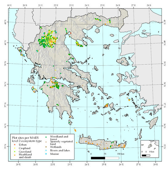 Since 2015, Greece has been developing methodologies, actions, and capacity building workshops and projects to integrate MAES into management practices and decision-making processes (e.g., [20,21,22,23]). These efforts, conducted under the requirements of the EU Biodiversity Strategy, are mainly supported by the Action A.3 of the Life Integrated Project “LIFE-IP 4 NATURA” [24], led by the Hellenic Ministry of Environment and Energy, which aims to implement the MAES approach at the national, regional and local (case-study) level. However, the relevant preparatory actions and literature review revealed significant data gaps across the Greek territory, especially for ES identification and ecosystem type documentation, including their condition, outside the Natura 2000 protected areas network [20,22]. Within the LIFE-IP 4 NATURA project, there is an ongoing effort for homogenizing existing and generating new spatial datasets, which are essential for the MAES implementation. Yet, it is evident that up-to-date, precise and content-rich field data are urgently needed to support various aspects of the implementation process.