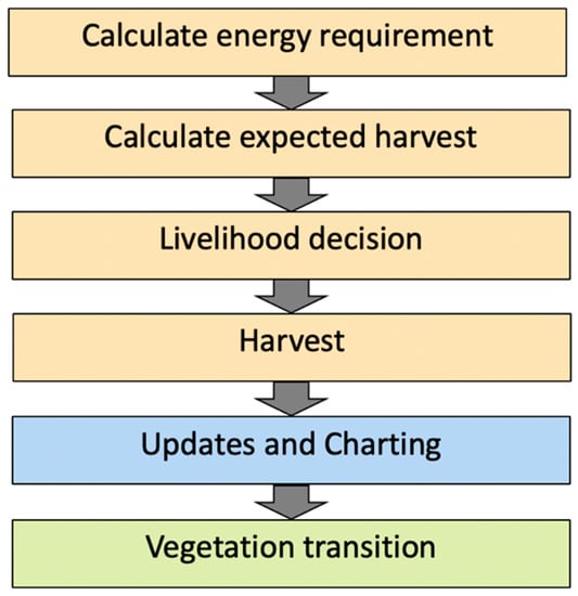 The model proceeds in annual time steps, and simulations were run for 60 years, with 40 repetitions for each scenario. Within each time step, six modules are processed in the order corresponding to Figure 2. Within each module, the agents conduct the respective processes in a random order.