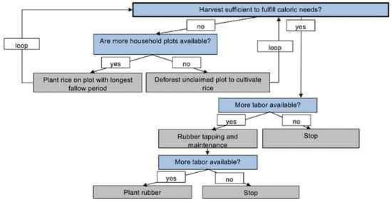 Based on expected harvest, households make decisions about additional livelihood activities in the current period. Given the cost of searching and comparing alternative actions combined with limited cognitive and computational abilities of humans, a bounded rationality approach including a satisficing heuristic was applied to simulate farmer decision making [,]. A decision tree represents decision making as a series of if-then-else statements, as illustrated in Figure 3. The baseline scenario considers rice and jungle rubber, which are the main livelihood activities in the study area. The respective decisions depend on caloric needs and resource availability. Farming households prioritize to fulfill their caloric needs, which represents the aspiration threshold, through rice planting before engaging in market production of rubber [,]. If the households have claimed available plots, they choose to plant rice on the plot with the longest fallow age, which represents a preference for clearing secondary fallow over primary forest []. Only if no such plot exists, then the household decides to clear an unclaimed plot through slash and burn, located within a radius of six kilometers, to plant rice there. The household continues planting rice until the caloric needs are expected to be satisfied. The maximum area for clearing unclaimed areas is set to four hectares per period. Once the harvest meets the caloric requirements, the households check whether they have more labor available. If that is the case, they engage in rubber tapping and maintenance. If still more labor is available, they decide to plant additional jungle rubber as a cash crop. The maximum amount of rubber is restricted to 1.2 ha, in line with survey results.