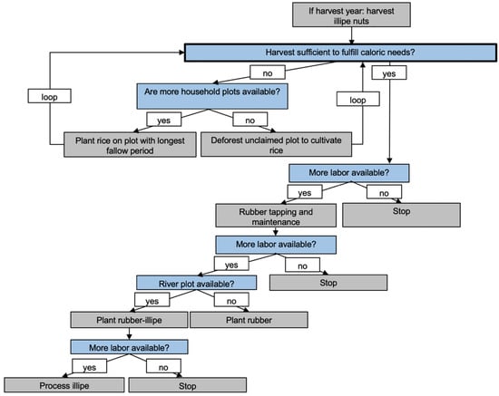 Extending the baseline scenario, farmers have the option to additionally plant illipe trees mixed with rubber agroforestry on their plots on riverbanks as an option to generate cash income (Figure 4). First, they harvest illipe nuts if it is possible in that season. Then, consistent with the baseline scenario, households aim to fulfill caloric requirements through swidden agriculture on already claimed or newly cleared plots. When the expected yields suffice to ensure food security, rubber has been tapped, and more labor is available, the households check whether they have fallow plots in proximity to a river available. If they do not, they plant jungle rubber on another plot. If they do, they cultivate IRA on that plot. If still more labor is available to the household during an illipe nut harvesting season, they process the illipe nuts into fat.
