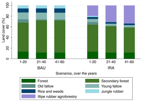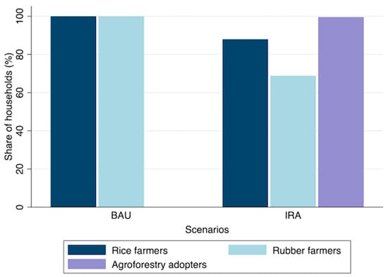 One main simulation outcome is the farmers’ livelihood choice. The simulations demonstrate that hill rice farming plays an essential role for the population, as illustrated in Figure 6. Conforming with the decision-making heuristic, all farmers cultivate rice on fallow plots in the BAU scenario. However, if the opportunity to adopt IRA exists, only 88% of the farmers engage in rice cultivation as part of a swidden agricultural system, which poses a significant difference between the IRA and the BAU scenarios (p = 0.000). In addition to rice, rubber as a cash crop is an integral part of the rural farming livelihoods. Again, in line with the decision heuristic, all farmers engage in jungle rubber farming in the BAU scenario, but significantly fewer farmers (69%) plant jungle rubber in the IRA scenario (p = 0.000). With respect to agroforestry, the IRA scenario exhibits high adoption rates with 99.6% of the farmers implementing IRA to generate additional cash. Thereby, the majority of farmers reduce their labor input for rice and jungle rubber cultivation in favor of the illipe tree mixed with rubber type of agroforestry implementation. They still engage in swidden agriculture and agroforestry simultaneously to create diversified livelihood portfolios. Particularly, in the years before the first agroforestry harvest and in the periods when illipe nuts cannot be harvested, farmers increase their labor input for rice cultivation. According to the simulations, 27% of farmers who cultivate IRA process illipe nuts into fat in the years of harvest.
