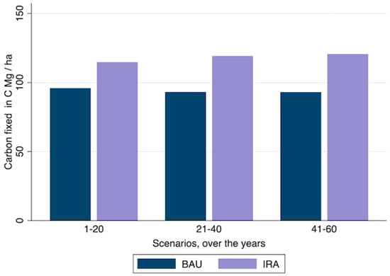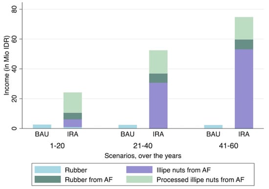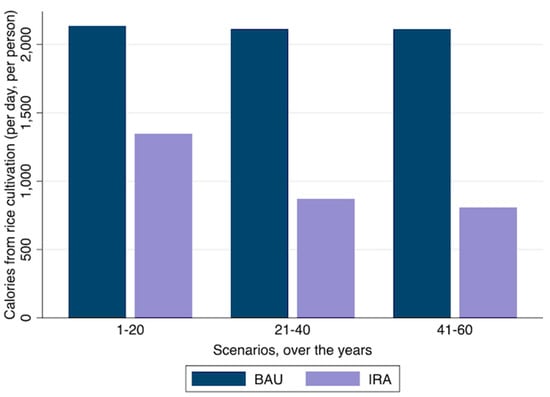 Based on the farmers’ livelihood decisions, the simulations reveal changes in rice consumption and cash income (Figure 7 and Figure 8). As IRA adopters reduce their labor input for rice cultivation, the calories available through rice cultivation decrease significantly from 2121 kcal available per person per day on average in the BAU scenario to 1009 kcal in the IRA scenario (p = 0.000). In contrast, cash income greatly increases in the IRA scenario compared with the BAU scenario (p = 0.000), enabling farmers to buy rice for example. Thereby, illipe nuts from agroforestry contribute to income to the largest extent with 84% and with a positive trend over time, as Figure 8 shows the development for the years 1–20, 21–40, and 41–60. The notable difference in incomes gives an indication about the potential of agroforestry to increase wealth and alleviate poverty. Generally, food insecurity is not a severe problem.