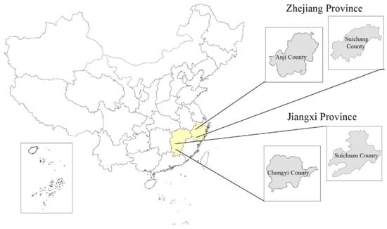 Anji and Suichang in Zhejiang province and Suichuan and Chongyi in Jiangxi province were chosen as research areas (as shown in Figure 1); these four forest-dependent counties were selected based on the bamboo resources and forest tenure reform, and because they are the critical priority forest counties and advanced counties that have promoted the CFTR in China []. Anji County is located in the northwest of Zhejiang province, with 70.2% forest cover in 2018 []; its bamboo stock and commercial bamboo are ranked first in the country. Take the bamboo industry as a leading industry; it is known in China as “Bamboo County”. Suichang County lies in the southwest of Zhejiang province. With 83.4% forest cover in 2018 [], it has great potential in the bamboo industry, and it is also the main bamboo production area for Zhejiang province. Suichuan County lies in Southwestern Jiangxi province, with 78.8% forest cover in 2018 []; bamboo is also among the pillar industries within it. Chongyi County lies in Southwestern Jiangxi. With 88.3% forest cover in 2018 [], it has abundant forest resources, and was named the “Hometown of Bamboo in China”.