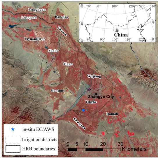 Spatial location of study area in Heihe River Basin (HRB) in Northwest China. Standard false-color map of composite 543 bands of Landsat 8 images on 29 September 2015 from the U.S. Geological Survey (USGS) dataset (https://earthexplorer.usgs.gov/ accessed on 6 April 2021) shows scope of study area, with irrigated area and cropland station (Daman superstation (DMS)) in midstream of HRB. In situ Daman superstation observation system includes eddy covariance (EC) and automatic weather station (AWS) system.