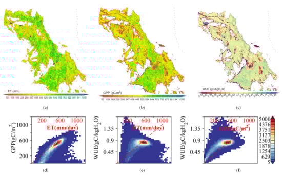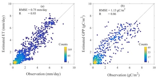 Land surface gross primary productivity (GPP) and evapotranspiration (ET) are key parameters for characterizing surface physical and biological processes in ecosystems. A strong coupling relationship exists between GPP and ET. For instance, in corn farmland, the vegetation transpiration components of ET can increase directly with increased GPP and the soil evaporation components of ET can decrease associated with increased GPP []. Against the background of human activities and global warming, one of the prerequisites for rational carbon–water management is to have an accurate measure of the ET and GPP characteristics of a terrestrial ecosystem. This understanding plays an essential role in the sustainable development of the regional ecological environment and regional water resource management.