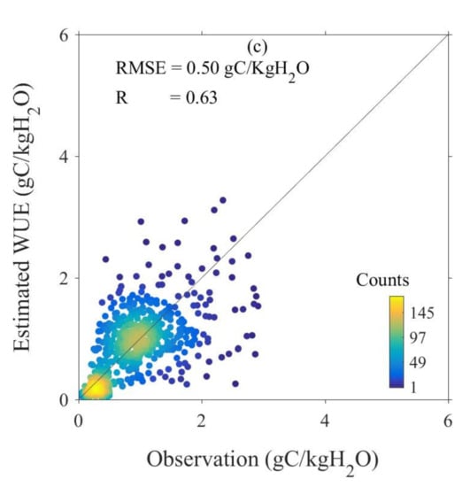 Comparing the observed ET or GPP with the estimated WUE based on a dataset from one site could bring uncertainties as a result of differences in the observation orientation and environmental conditions at a given in situ station []. In addition to the inherent uncertainties in the validation data of EC and GPP, the mismatched spatial locations between estimated ET, GPP, and EC measurements will also affect the accuracy [,].