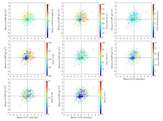 Scatterplots of daily GPP and ET biases with daily WUE.