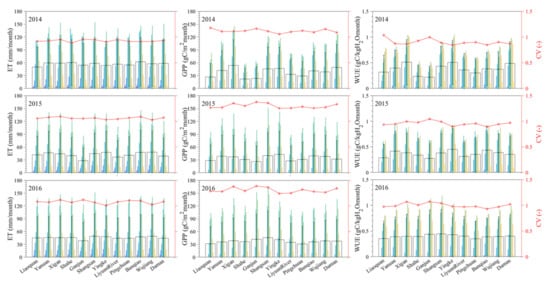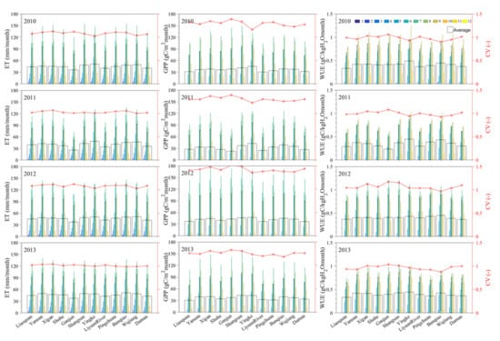 The temporal dynamics of the multi-year ET, GPP, and WUE in each irrigation district from 2010 to 2016 are shown in Figure 7 (histograms represent the average of oasis agricultural areas with the geographical location identified by the 12 irrigation districts). The multi-year regional average values (Figure 7, black box) and the multi-year temporal dynamics coefficient of variation (CV) characteristics (Figure 7, red stars) of GPP, ET, and WUE for each irrigated district were similar in midstream oasis agricultural areas.