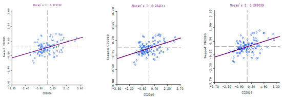 The global Moran’s I index was adopted to analyze the spatial correlation level of coordinated development, and the spatial weight matrix was constructed in the GeoDA platform. Based on the coordinated development degree of 110 cities in the YREB in 11 years, the correlation level of coordinated development was calculated (Figure 5). In the Figure 5, CD2006, CD2010, and CD2016 represent the autocorrelation level of coordination degree in 2006, 2010 and 2016, respectively.
