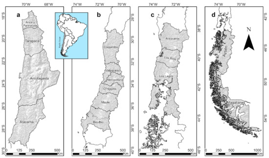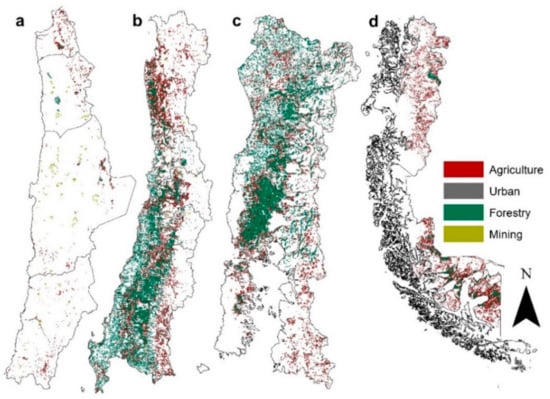 - Miranda, A.; Altamirano, A.; Cayuela, L.; Pincheira, F.; Lara, A. Different times, same story: Native forest loss and landscape homogenization in three physiographical areas of south-central of Chile. Appl. Geogr. 2015, 60, 20–28. [Google Scholar] [CrossRef]