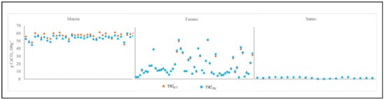 Overall, TIC values, obtained through calcimeter and dry combustion method, varied from 0.35 to 60.06 g 100 g−1, with a range of 59.71 g 100 g−1, and 0.45 to 61.75 g 100 g−1, with a range of 61.30 g 100 g−1, respectively (Figure 1). An ample range of variation was observed for Fasano samples (from 2.45 to 53.24 g 100 g−1, range of 50.79 g 100 g−1), as shown by the highest values of the coefficient of variation (CV, Table 3).