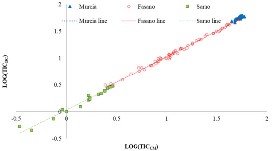 Descriptive statistics for TIC, detected using the calcimeter (TICCM) and dry combustion (TICDC) methods, computed per experimental site, and on the whole dataset, are reported in Table 3. Average TIC content, quantified through calcimeter method, was 26 g 100 g−1, with mean values ranging from 1.86 g 100 g−1, in Sarno, to 53.85 g 100 g−1, in Murcia.