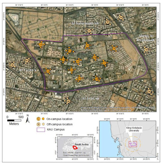 The analysis was performed on King Abdulaziz University (KAU) campus, Jeddah, Saudi Arabia, and four surrounding neighborhoods: Al Sulaymaniyah from the north, Abruq Ar Rughamah from the east, Al Jami’ah from the south, and from the west Al Fayha’a (Figure 1).
