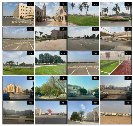 Survey site photos (selected measurement sites) (sites labeled ‘C’ are on campus and sites labeled ‘N’ are outside of campus as seen on the orientation map, Figure 1): (C1) Parking lot; (C2) Pedestrian walkway made of granite and precast concrete; (C3) Grassy park; (C4) Roundabout with vegetation and a water fountain made of granite; (C5) Large parking lot; (C6) Park with a central walkway made of precast concrete; (C7) Large road; (C8) Parking lot with shading structures; (C9) Brick pedestrian walkway with some vegetation; (C10) Small park with grass and trees; (C11) Large parking lot; (C12) Artificial turf field; (N1) Local neighborhood street; (N2) Parking lot with trees; (N3) Local neighborhood street; (N4) Playground with no vegetation; (N5) Park with small grassy patches; (N6) Main road; (N7) Local neighborhood street; (N8) Open area with no vegetation.