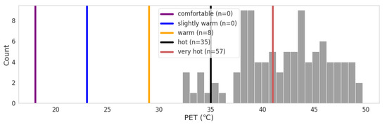A histogram shows the distribution of median PET per location (n = 100) across several thermal comfort levels. Following the scale presented in Table 1, there are 57 locations with median PET in the “very hot” range (above 41 °C), 35 locations with median PET in the “hot” range (above 35 °C and up to and including 41 °C), 8 locations with median PET in the “warm” range (above 29 °C and up to and including 35 °C), and no locations with median PET below the 29 °C threshold.