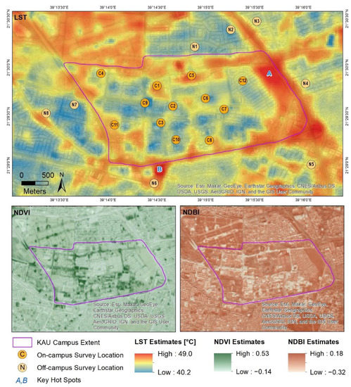 The 20 primary locations against the LST estimates (top); Normalized Difference Vegetation Index (NDVI) and Normalized Difference Built-up Index (NDBI) distribution (bottom left and bottom right, respectively). These composite images are the median values for the four Landsat-8 overpasses (12 August, 28 August, 13 September, 29 September).