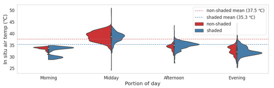 Distributions of Tair (°C) measured in situ across 100 measurement sites (outliers removed) for Morning, Afternoon, Evening and Night for shaded (blue, n = 1724) and non-shaded (red, n = 1659) observations.