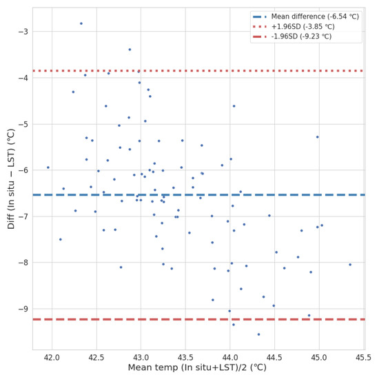 The Bland-Altman plot shows the upper (red dotted) and lower (red dashed) thresholds of 1.96 standard deviations from the mean difference in Tair (measurements taken across all 100 sites between 12 p.m. and 1 p.m. local time, n = 869) and LST (28 August and 13 September mean composite), with 96% of the data within these limits. The mean difference (blue dashed) is below 0, indicating a bias such that LST is consistently higher, a difference that appears to increase as the temperature increases.