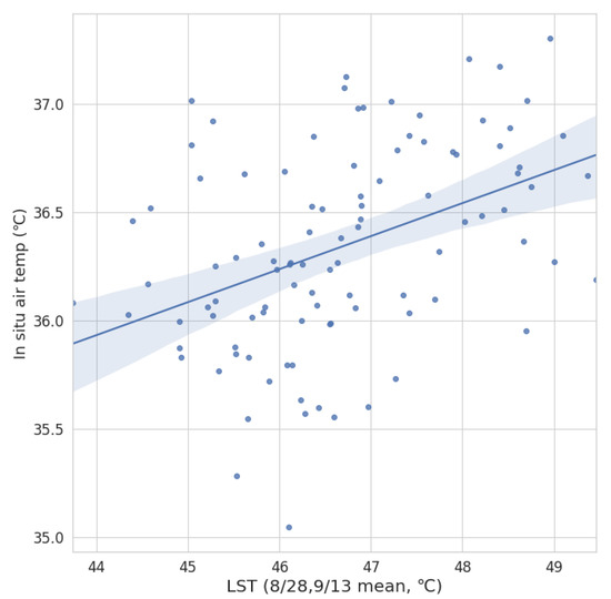 One of the key objectives of this study was to examine the potential utilization of remotely sensed derived LST to estimate Tair and thermal comfort. We did not attempt to conduct an exact calibration of the two measures; rather, we wanted to understand their relative compatibility to detect spatial patterns of temperature variations. We used the Bland-Altman method to compare the mean and the difference of Tair and LST. This method allowed us to identify acceptable parameters and any potential biases; it is often used in the literature for assessing agreement when simple correlation is not adequate [89]. Figure 6 presents a comparison (scatterplot) of the mean and the difference between Tair and LST across 869 measurements collected between 12 p.m. and 2 p.m. local time (closest to the Landsat-8 overpass window time that data were collected). The results suggest that the distribution of the difference is normal (per Shapiro-Wilk test, p = 0.719) and that 96% of the observations are within 1.96 standard deviations of the mean difference (i.e., above the 95% threshold). There is a bias evident such that the overall LST temperatures were on average 6.54 °C above that of Tair, whereas if the differences were due to stochastic error alone, we would expect the average to be zero. This bias tends to increase as the temperature increases. While we did not find a statistically significant correlation between LST and in situ data collected between 12 p.m. and 2 p.m., there was a significant correlation (r = 0.45, p < 0.001) between LST and the mean Tair for each measurement site (n = 100) across all observations (n = 3393) (Figure 7).