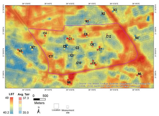 As explained above, in this study we sought to understand the relative compatibility between LST, Tair and PET in detecting spatial patterns of temperature variations. As illustrated in Figure 8 (a visual assessment of the correspondence between the distribution of Tair,max per measurement site against LST estimations), there was a general visual correspondence between LST and Tair patterns. For example, the green space in the roundabout leading to campus administrative buildings (Figure 8, C9) and the green space near the women’s campus (Figure 8, C10), which are characterized by the lowest LST (41 °C and 42.9 °C, respectively), are also among the coolest locations as indicated by Tair (Tair,max is on average 43.1 °C and 42.5 °C in these locations, respectively).