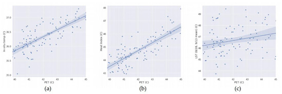A scatterplot of (a) mean PET per location vs. mean in situ air temperature per location (n = 100), where there was a significant correlation (r = 0.73, p < 0.001); (b) mean PET per location vs. mean Heat Index (r = 0.75, p < 0.001); (c) mean PET per location and LST (28 August and 13 September mean), which was weakly correlated and not significant to the same degree, but still showed a relationship (r = 0.23, p = 0.02).
