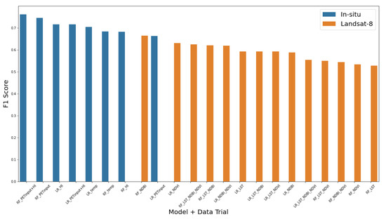 The model and data trials used to classify which of the locations (n = 100) were “very hot” with median PET over 41 °C. As expected, the models using in situ data (blue) did better, with the top-performing model (Random Forest (RF) with air temperature, relative humidity, average wind speed, cloud coverage, and heat index) attaining an F1 score of 0.76116. However, the top-performing model using only remote sensing data (RF with NDBI) attained an F1 score of 0.66429, which was competitive with the in situ based models and even outperformed a linear regression (LR) model using in situ data.
