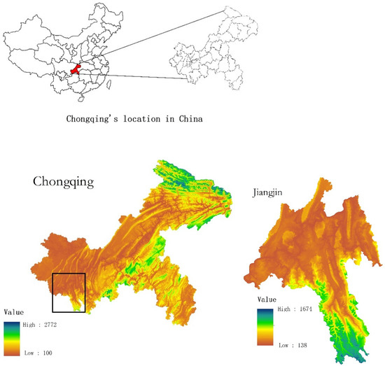 Jiangjin District is located in southwestern Chongqing in China (Figure 1) and covers an area of 3217.8 km2. It is adjacent to Hejiang County in Sichuan Province and Xishui County in Guizhou Province. It is at the end of the Three Gorges Reservoir area, and the Yangtze River runs around the city. Geographically, Jiangjin is located at the southwest end of the parallel ridge valley fold area in eastern Sichuan. The terrain is high in the south and low in the north, and the landform is dominated by hills and low mountains; 65.10% of the area is hills, 31.80% is mountains, and 3.10% is valley terraces. Jiangjin is in the humid subtropical monsoon climate zone, with four distinct seasons and climate cultures. It has abundant rainfall; the annual average temperature is 18.3 °C, and the annual average precipitation is 1025 mm. Rivers crisscross the territory; in the upper reaches of the Yangtze River system, the Yangtze River and its tributaries are extremely rich in transit water resources, because Jiangjin industrial and agricultural production provides superior water resource conditions.