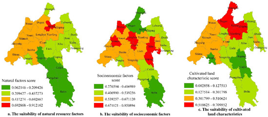 According to Figure 3b, from the perspective of socioeconomic suitability, the score shows a trend of low in the south and north of the study area and high in the central area. This trend mainly has two causes. First, the northern part of the research area is the main area of urban development, and it is dominated by the development of nonagricultural industries, leading to a low suitability score. Second, the southern part of the study area is largely higher altitude mountainous area dominated by tourism and the tourism industry; it has less agricultural development, and so the suitability score is not high.
