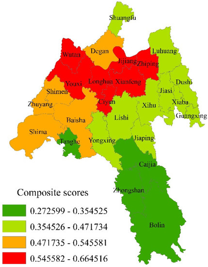According to the original evaluation matrix constructed in the previous step, the weight of each index was calculated by Formulas (5)–(7), as shown in Table 3. The weights of the N4, N5, and L3 indexes were greater than 0.10, indicating that the forest coverage rate, proportion of orchard area, and degree of cultivated land fragmentation were the main factors affecting the evaluation system. Second, the index weights of N1, S1, S2, S5, L1, and L2 were greater than 0.05, indicating that the elevation standard deviation, main road density, secondary road density, proportion of agricultural output value in total output value, proportion of cultivated land area, and proportion of cultivated land area with a slope below 15° also played an important role in the evaluation system.