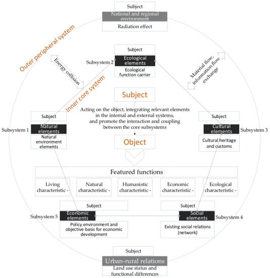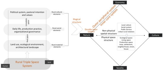 The rural regional system is part of urban–rural integration. It is a regional open system with a certain functional structure which is formed by the interaction and connection of its subsystems. The subsystems include location conditions, natural environment, cultural heritage, policy conditions, and economic basis. The function of a rural regional system reflects its development stage, as the rural regional organism is an important carrier for factor allocation and function organization. According to the spatial production theory of Henri Lefebvre [22], the rural regional organism is space system constructed by resources, rights, society, and capital. So, based on the three-dimensional rural space system of culture, society and material proposed by Halfacree [23], from the human–land interaction perspective, this study analyzed the space system of the rural organism from the two dimensions of the inner core system and the outer periphery system [24] (Figure 1).