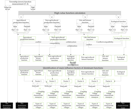 The decision tree judgment method is as follows: (1) Towns have multiple functions for the measurement of multiple functions and the judgment of dominant functions; the function group method must be obtained. (2) The decision tree method can be used to express the process of how to zone the dominant function, and the high-value function must be determined in the zoning process. (3) After determining the dominant function, the main factors affecting the dominant function need to be further identified. (4) Finally, for the characteristic type of a specific village, the dominant function of the town should be coupled with the characteristic resources of the specific village [45]. The following four factors need to be considered in the coupling process: (1) the “state” value and “potential” value of the dominant function; (2) the LISA cluster map of function and influencing factors; (3) the effect of the positioning of the county/city relative to the town on social, natural and economic functions; and (4) the sensitivity of the village to resources, policies, and the environment. The above four factors are included in the evaluation of the characteristic type of any village. A complete decision tree method involves three parts: selecting the dominant function according to the function calculation value, forming several different functional advantage areas in space, and then determining the characteristic village type according to the total characteristic resources of the village and other production capacity performances (Figure 5).
