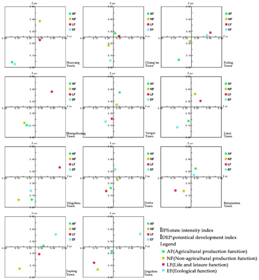 Among them, I I F S represents the “state” intensity index of a certain single function in a town, and I D F P represents the “potential” development index. S i represents the value of the i th function in a town; X i j denotes the j indicator in “state” of the i th function; w j represents the weight of j indicator; and n is the number of “state” indicators. Y i f denotes the f indicator in the “potential” of the i th function; w f represents the weight of f indicator; and k is the number of “potential” indicators.