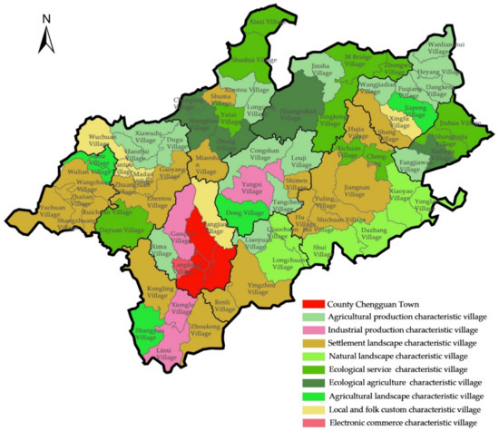 Competitiveness stems from ontological elements, functional structure, and political environment [48]. In a town, spatial pattern determined by the dominant function—characteristic resources of the village are the main driving force for shaping the characteristic type and competitiveness [49]. The characteristic resources of the village help the rural regional system win higher scores in dominant functions. Characteristic resources mainly refer to natural ecological resources, agricultural production resources, tourism landscape resources, historical and cultural resources, and industrial production resources. The coupling result of characteristic resources with the main influencing factors of functions is the classification of characteristic villages.