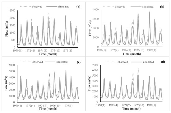 Monthly flow observation and simulation values of Tangnaihai (a), Toudaoguai (b), Sanmenxia (c) and Lijin (d) during calibration period (1970–1980).