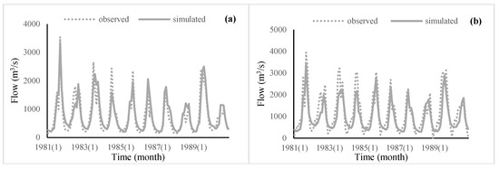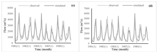 Monthly flow observation and simulation values of Tangnaihai (a), Toudaoguai (b), Sanmenxia (c) and Lijin (d) during validation period (1981–1990).