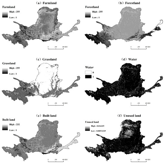 Suitability maps of farmland (a), forestland (b), grassland (c), water (d), built land (e) and unused land (f).