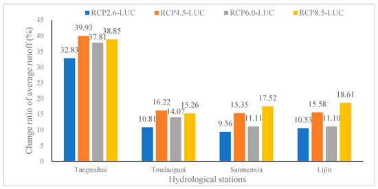 The differences between the average runoff of the four hydrological stations in the middle of the 21st century (2040–2060) and the base period (1970–1990) are displayed in Figure 12. The average runoff of Tangnaihai, Toudaoguai, Sanmenxia and Lijin stations under four RCP-LUC scenarios tends to increase compared with the base period. Compared with different RCP-LUC scenarios, the order of average runoff increment of Tangnaihai and Toudaoguai hydrological stations is RCP4.5-LUC>RCP8.5-LUC>RCP6.0-LUC>RCP2.6-LUC; the order of average runoff increment of Sanmenxia and Lijin hydrological stations is RCP8.5-LUC>RCP4.5-LUC>RCP2.6-LUC>RCP6.0-LUC.