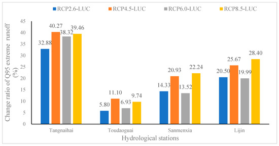 Compared with different RCP-LUC scenarios, the order of Q95 extreme runoff increment of Tangnaihai and Toudaoguai hydrological stations is RCP4.5-LUC>RCP8.5-LUC>RCP6.0-LUC>RCP2.6-LUC; the order of Q95 extreme runoff increment of Sanmenxia and Lijin hydrological stations is RCP8.5-LUC>RCP4.5-LUC>RCP2.6-LUC>RCP6.0-LUC. In a word, Tangnaihai and Lijin hydrological stations have the highest probability of flood disasters under the RCP4.5-LUC scenario, while Sanmenxia and Lijin hydrological stations have the highest probability of flood disasters under the RCP8.5-LUC scenario.