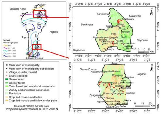 - Djedjebi, T.; de Hann, L.J. Local Land Management in Benin With Special Reference to Pastoral Groups. In Farmers and Scientists in a Changing Environment: Assessing Research in West Africa; Renard, G., Krieg, S., Lawrence, P., von Oppen, M., Eds.; Margraf Verlag: Weikersheim, Germany, 2000; ISBN 3-8236-1318-9. [Google Scholar]