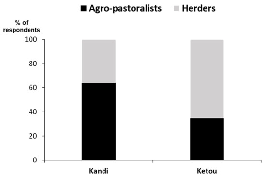 The presence of agro-pastoral medium-size herders with small areas of cropland and crop farmers with large areas of cultivated land and small herds in Kandi is consistent with the social change previously reported by Djenontin et al. (2004) [52] for this region. This trend towards mixed farming systems and agricultural intensification has been described for many West African pastoral areas as a recent coping strategy, whereby herders settled due to increases in population density and environmental pressures [58,59,60]. Our results suggest that the big crop farmers owning small herds are autochthonous households who shifted from sole crop farming to an integrated faming system after purchasing cattle. The medium-size herders with small cropland areas are pastoralists who settled and now practice crop farming and cattle herding. Desta and Coppock (2003) [61] observed that agricultural intensification in pastoralism systems is associated with a decline in per capita cattle numbers. This confirms the reduction of cattle herd numbers and the high production of cotton by farmers described by Djenontin et al. (2004) [52] for Kandi. The same notion is corroborated by the small- and medium-size cattle herds and the large areas of cultivated land that coexist in the same area. In contrast to Kandi, a relatively high number of pure crop farmers and pure herders with large cattle herds were observed in Kétou. This suggests a poor integration of livestock with crop farming and may be indicative for a recent process of transhumant herders settling in this region, as observed in other pastoral areas of southern Benin [62].