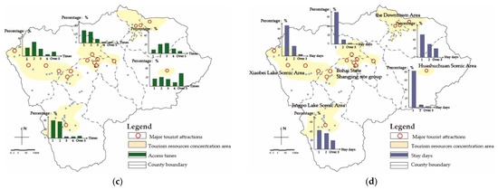 Investigation of tourism resources: (a) arrival mode, (b) motivation, (c) access times, and (d) stay days.