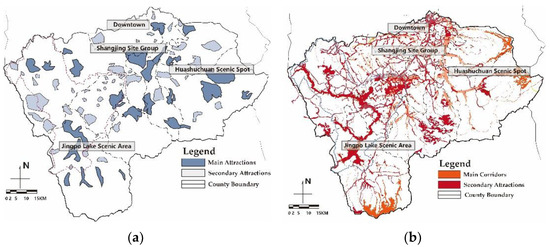 Our primary task was to determine the quantity and spatial distribution of resource nodes and corridors in Ning’an. The data for the analysis were obtained from remote sensing images (retrieved in March 2020, with a resolution of 10 m). The land cover map was interpreted from digital orthophotos using the ENVI 4.7 software. Based on the Master Plan for Ning’an (2011–2030), the nodes of tourism resources were divided into main attractions and general attractions (Figure 6a), which were extracted from remotely-sensed images in the ENVI software, with reference to GPS control points and field excursions.