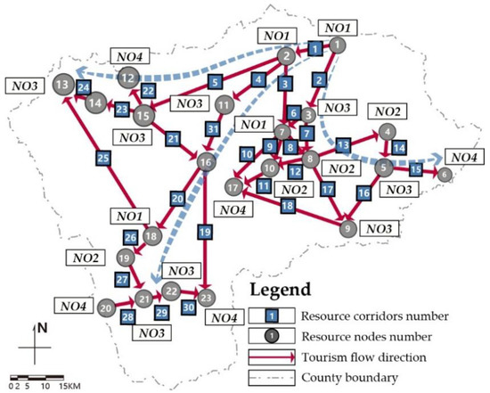 Tourism resources were regarded as “patches, corridors, or matrices” based on the theory of landscape ecology [23,28]. Then, a network was constructed that included the resource connection relationship and direction, which were determined by the scope of resources. Following, the hierarchical structure of the network was analyzed based on the resource connections and levels, and optimization was performed.