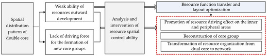 Spatial restructuring should adjust imbalances in the overall tourism resource system. The spatial pattern can be balanced by optimizing the structural pattern of tourism resources and guiding diffusion elements (Figure 13). This is used to drive the attraction of secondary resources and promote a balance in the entire tourism resource system. Additionally, the comprehensive benefits are improved, including improvements to the residential living environment, landscape quality, and types of entertainment activities.