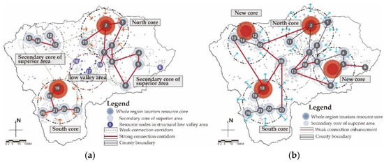 To improve stability, it is important to strengthen the connection in the network resources and increase the number of network loops. The balance of allocation requires a reduction in the low valley area during reconstruction. As a “dumbbell” spatial structure yields instability, especially in areas outside the “four groups,” we must focus on the loop between the secondary resources and the promotion of the tourism service value in the branch ends (Figure 14), which is an effective technique for breaking through the existing network structure.