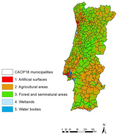 CORINE Land Cover of 2018 (level 1) distribution in Portugal, with municipal boundary definition (Carta Administrativa Oficial de Portugal: CAOP 2018).
