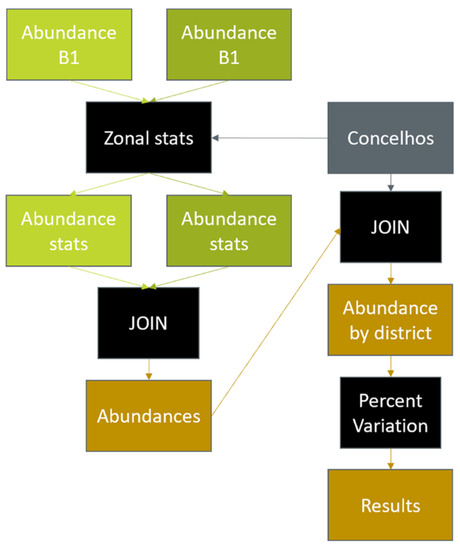 where is the percentage variation index for delivering pollination abundance for year 2018 in comparison to the baseline year 1990 for each concelho ©. The general flow is depicted in Figure 2, with a comprehensive modeling workflow for the percent variation of abundance index. This process was executed in ArcGIS software (ArcMap 10.6).